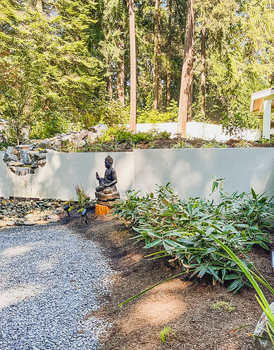 The core of the project is the actual design of a Japanese garden. A white smooth stucco-finished retaining wall built of concrete blocks provides a perfect minimalist backdrop for the rocks, gravel, moss and a babbling stream.