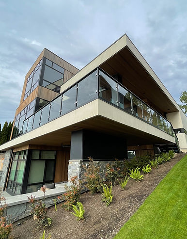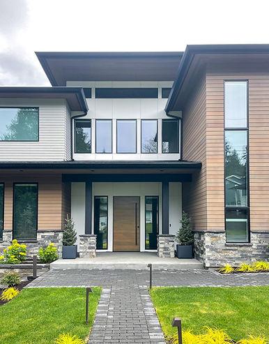 The facing of this cube-shaped home uses the Europlast material and K2 Stone. The clear lines, cedar siding and natural textures shout in unison, “There it is, modern style in all its glory!”