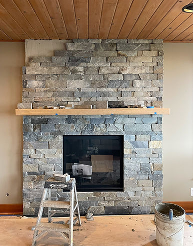 The fireplace mantelpiece is faced with a neat masonwork of K2 Stone. Alongside warm wood, the uneven gray stone surface makes for a supremely cozy living room interior that the family and friends will gravitate toward.