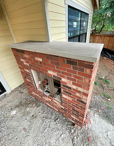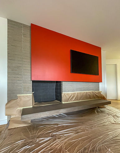 The neat brickwork of the fireplace, the long concrete podium and the graphite hearth highlight the modern interior decoration and the distinctive design of the home for recreation with the entire family or in the company of friends.