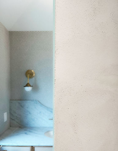 The shower room walls are covered with decorative stucco specially designed for areas exposed to moisture. This seamless monolithic finish for bathrooms is modern, practical and visually appealing.