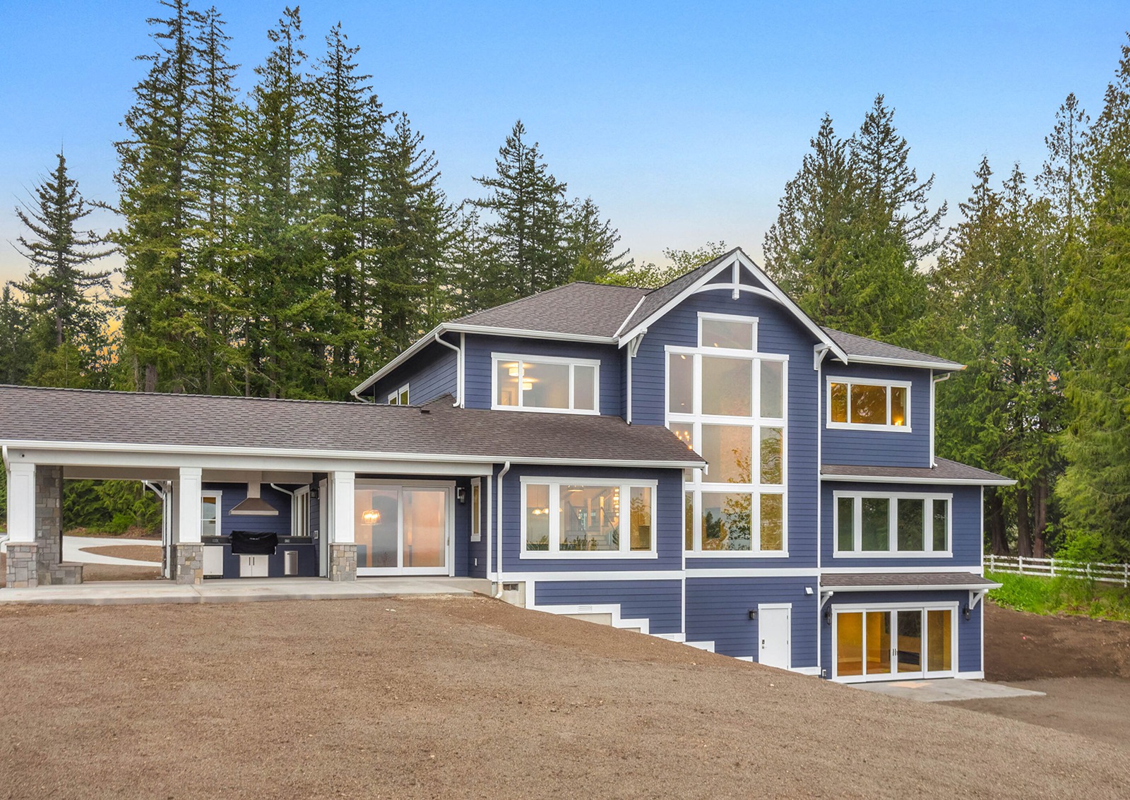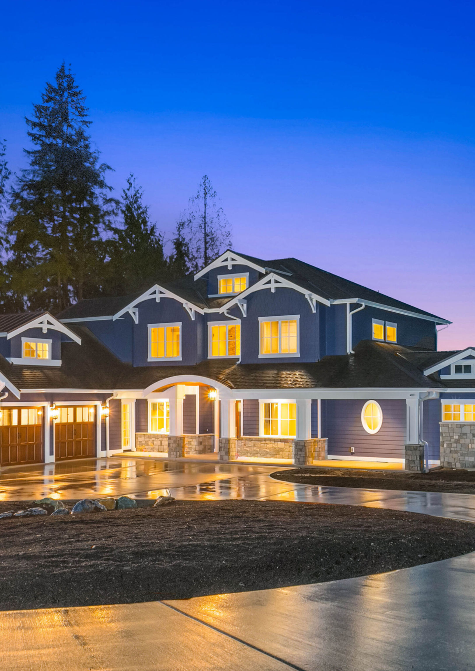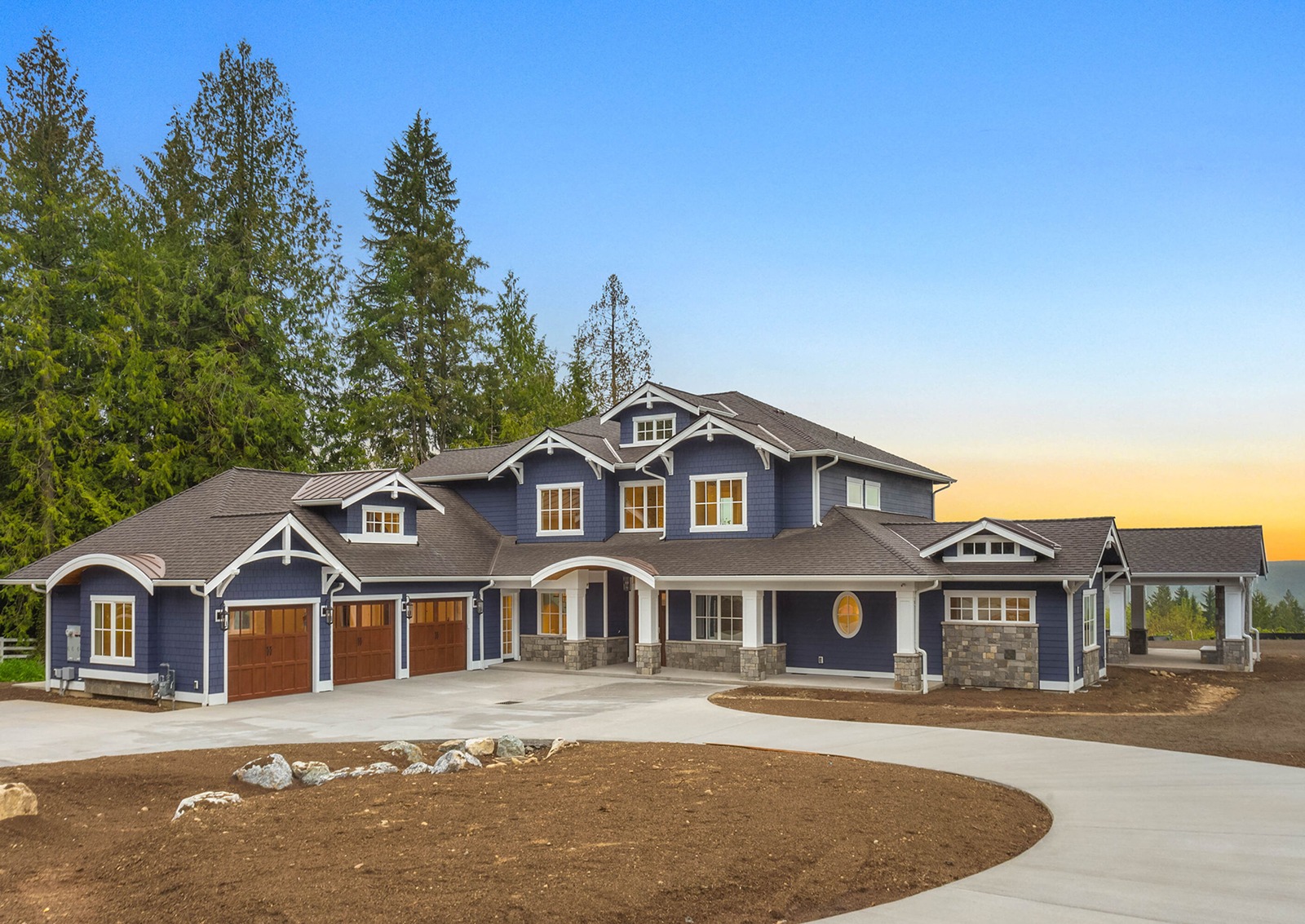 In this country home designed in the traditional style, dark siding combines with stone veneer on the base of the wall to highlight architectural details and shape the expressive outline of the facade and entryway.