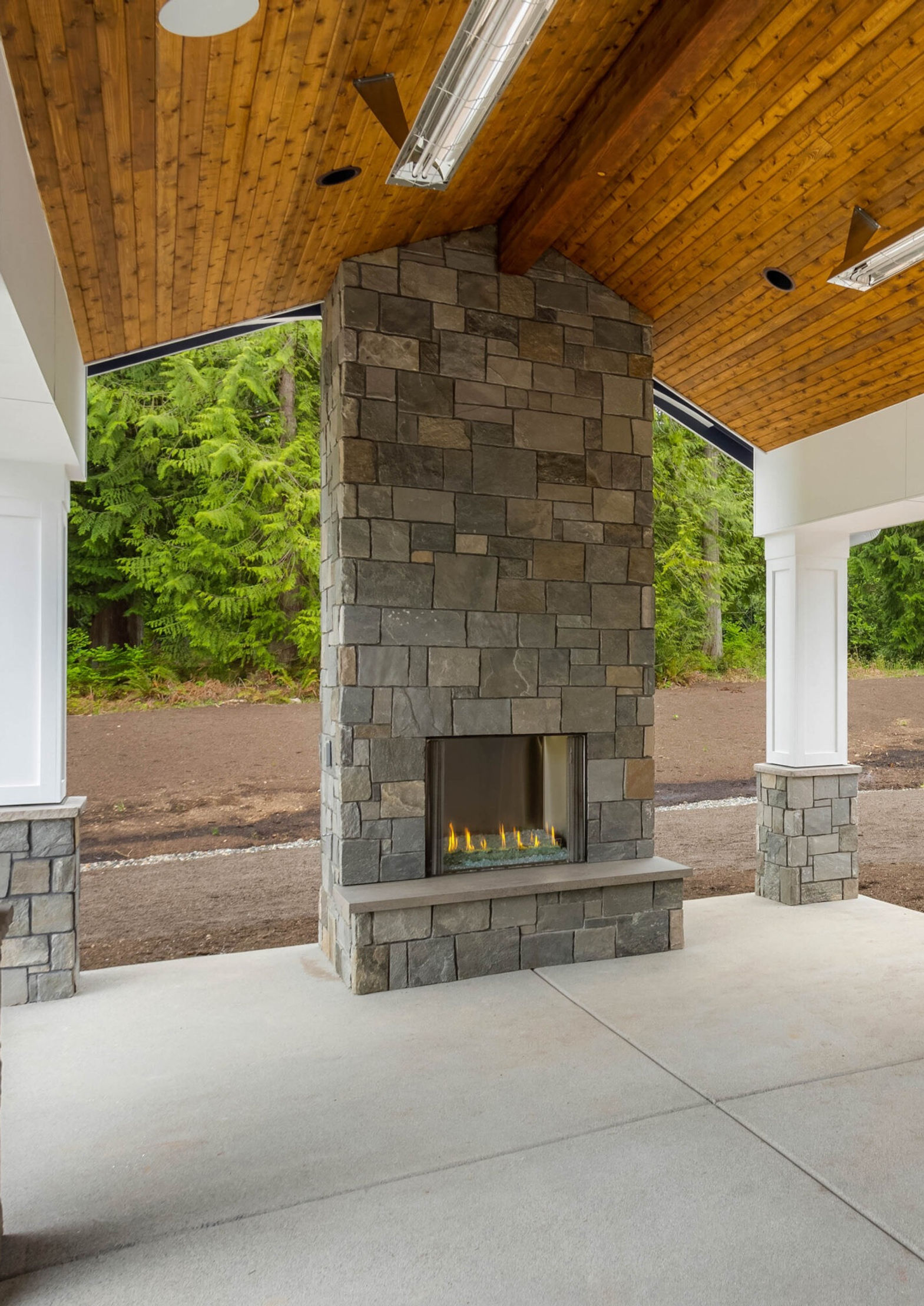 The fireplace mantelpiece is faced with a neat masonwork of K2 Stone. Alongside warm wood, the uneven gray stone surface makes for a supremely cozy living room interior that the family and friends will gravitate toward.