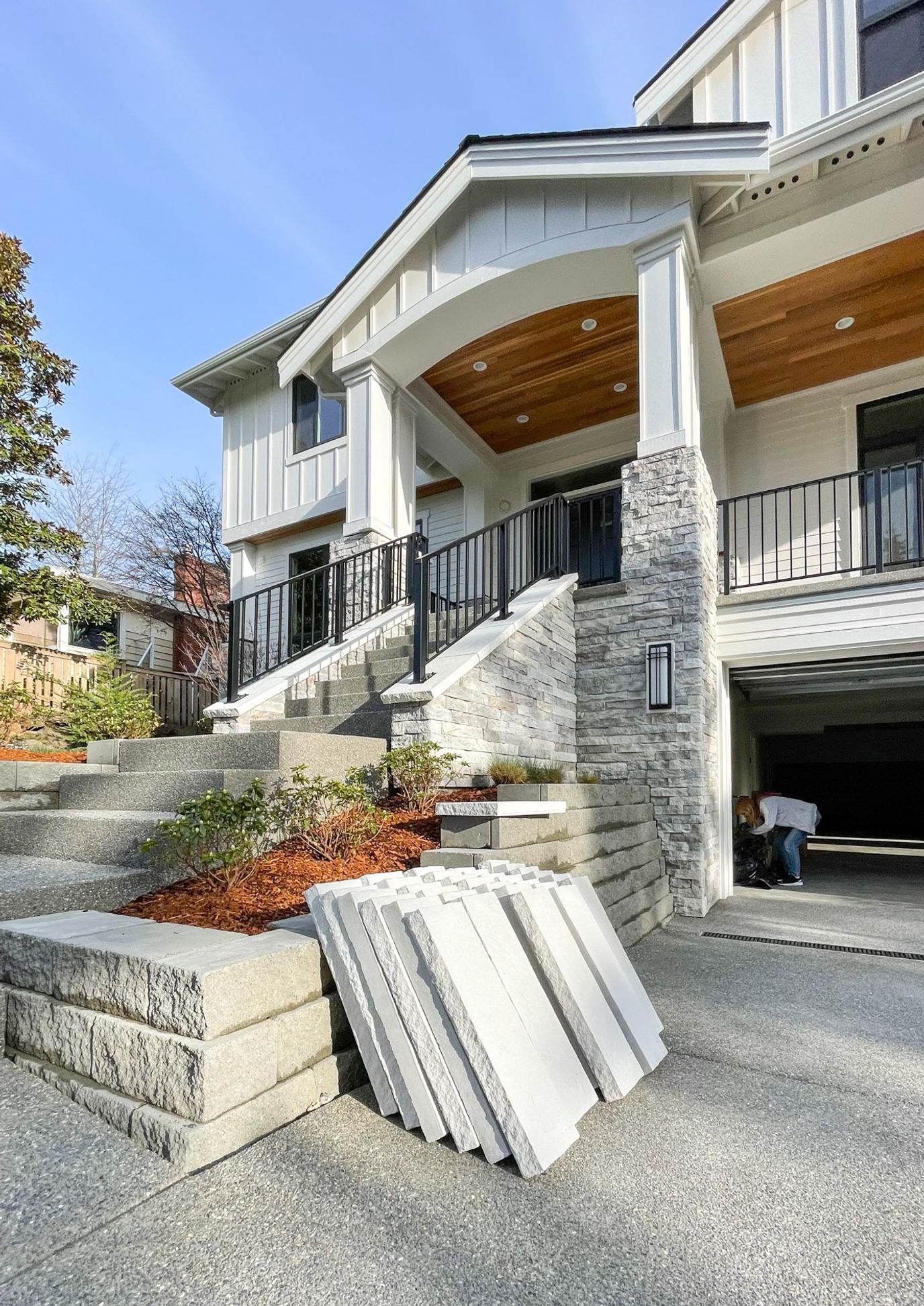 The recipe comes down to gray siding and light stone veneer decorating the tall arch above the entrance. The finished “dish” is a tidy modern country cottage with eye-catching architectural details.