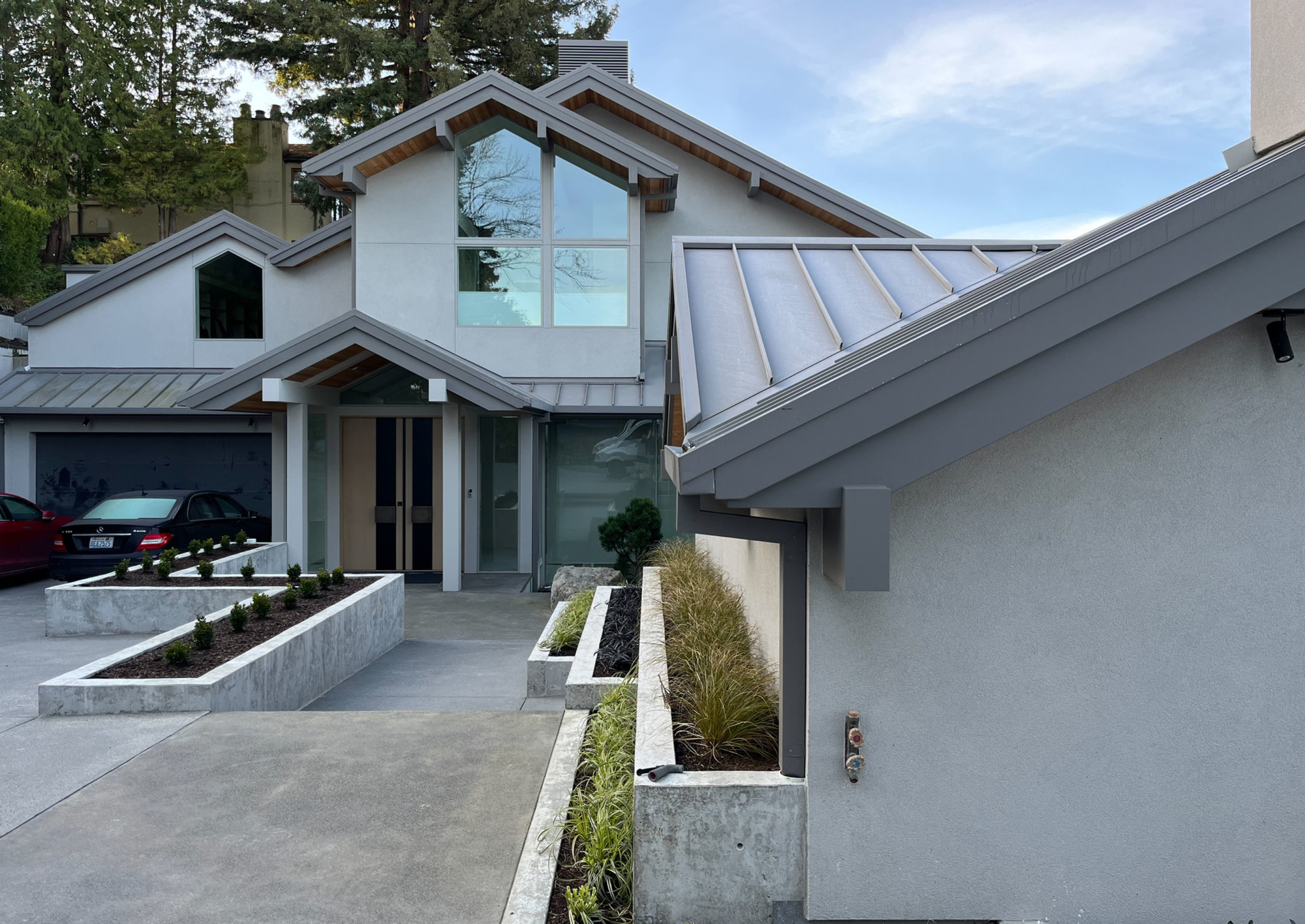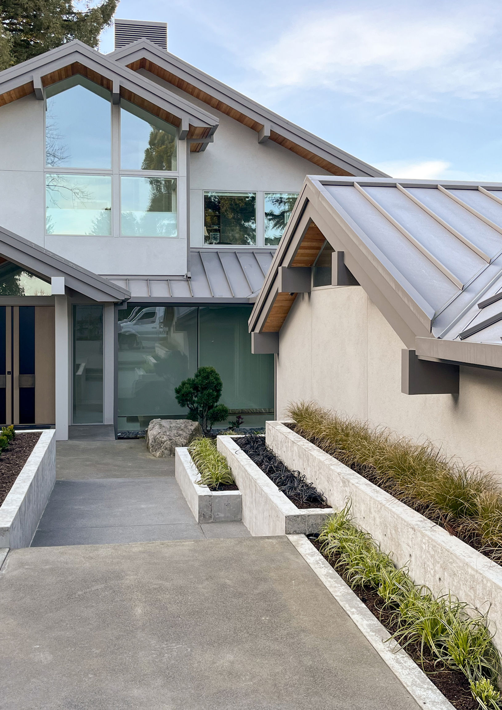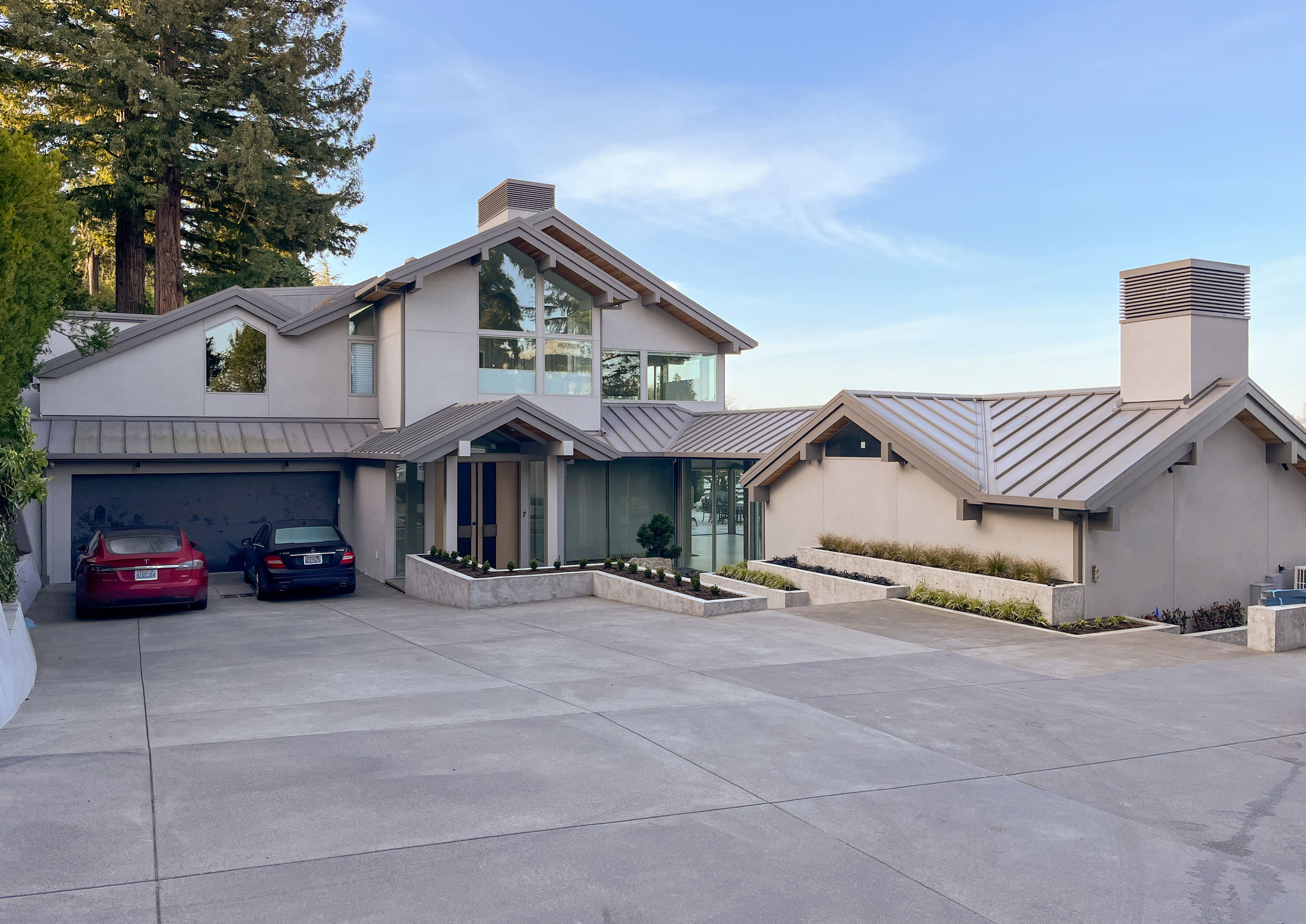 The perfection of architectural geometry, combined with an elastomeric stucco finish and a large glazing area, gives this building a futuristic look: a cosmic abode, right here on earth.