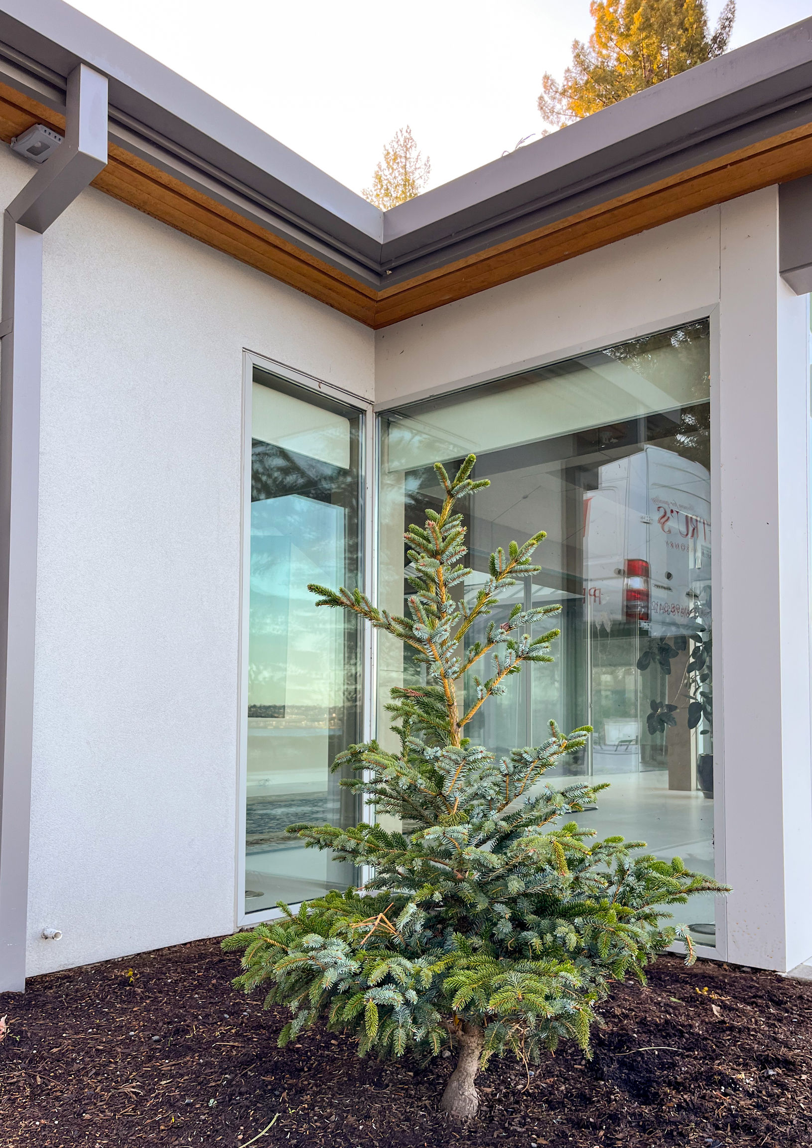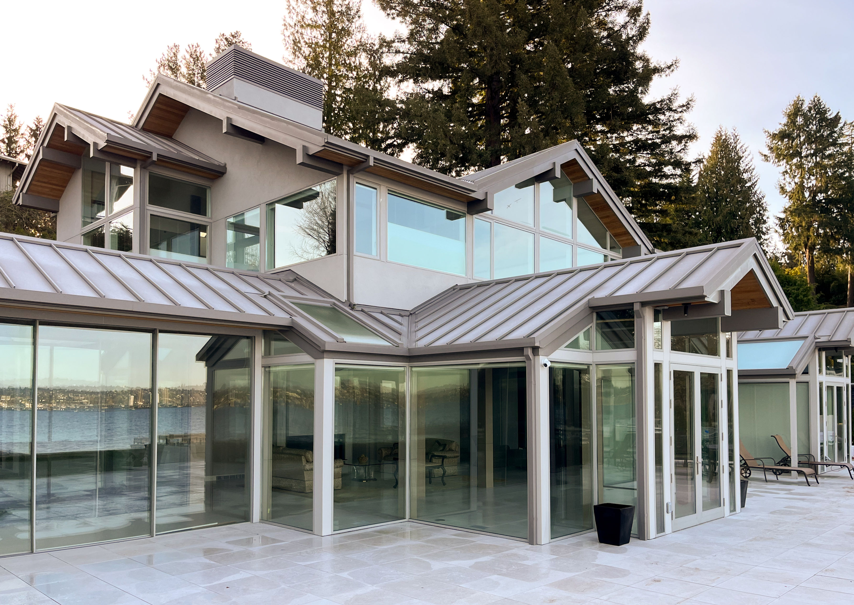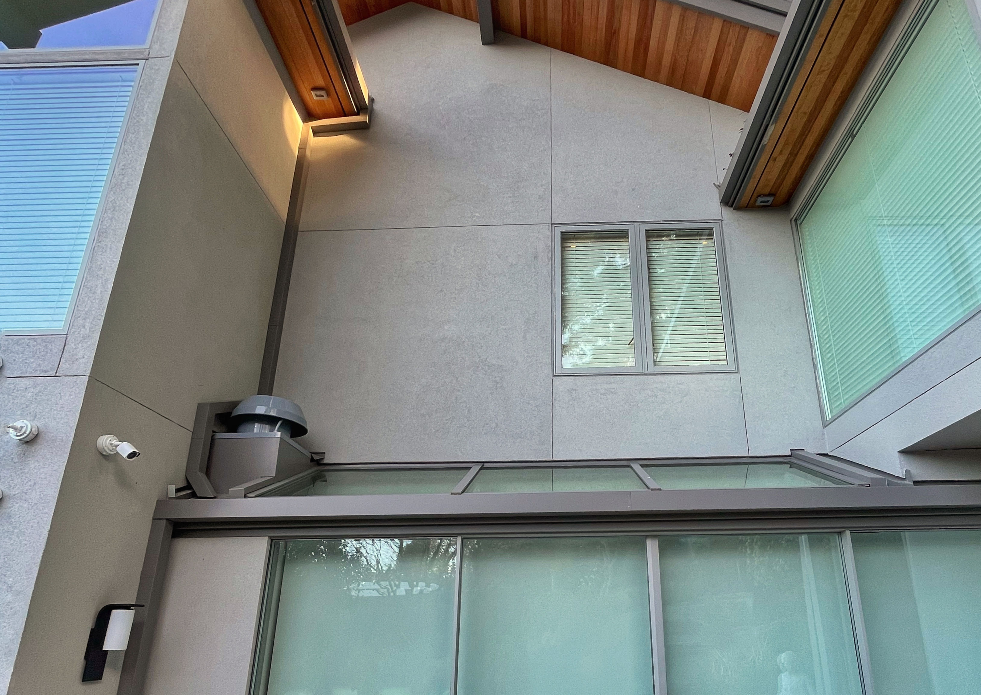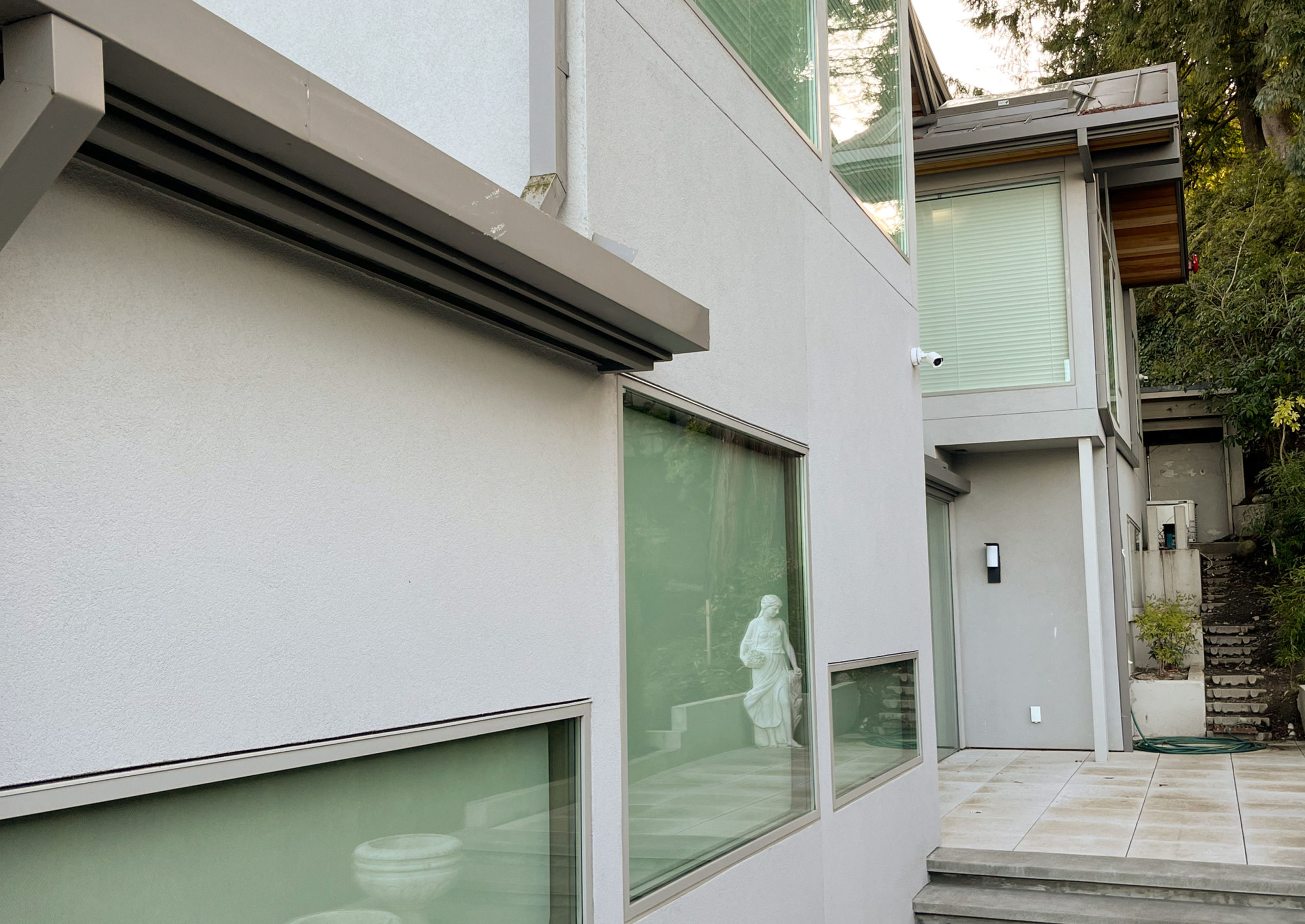 The perfection of architectural geometry, combined with an elastomeric stucco finish and a large glazing area, gives this building a futuristic look: a cosmic abode, right here on earth.