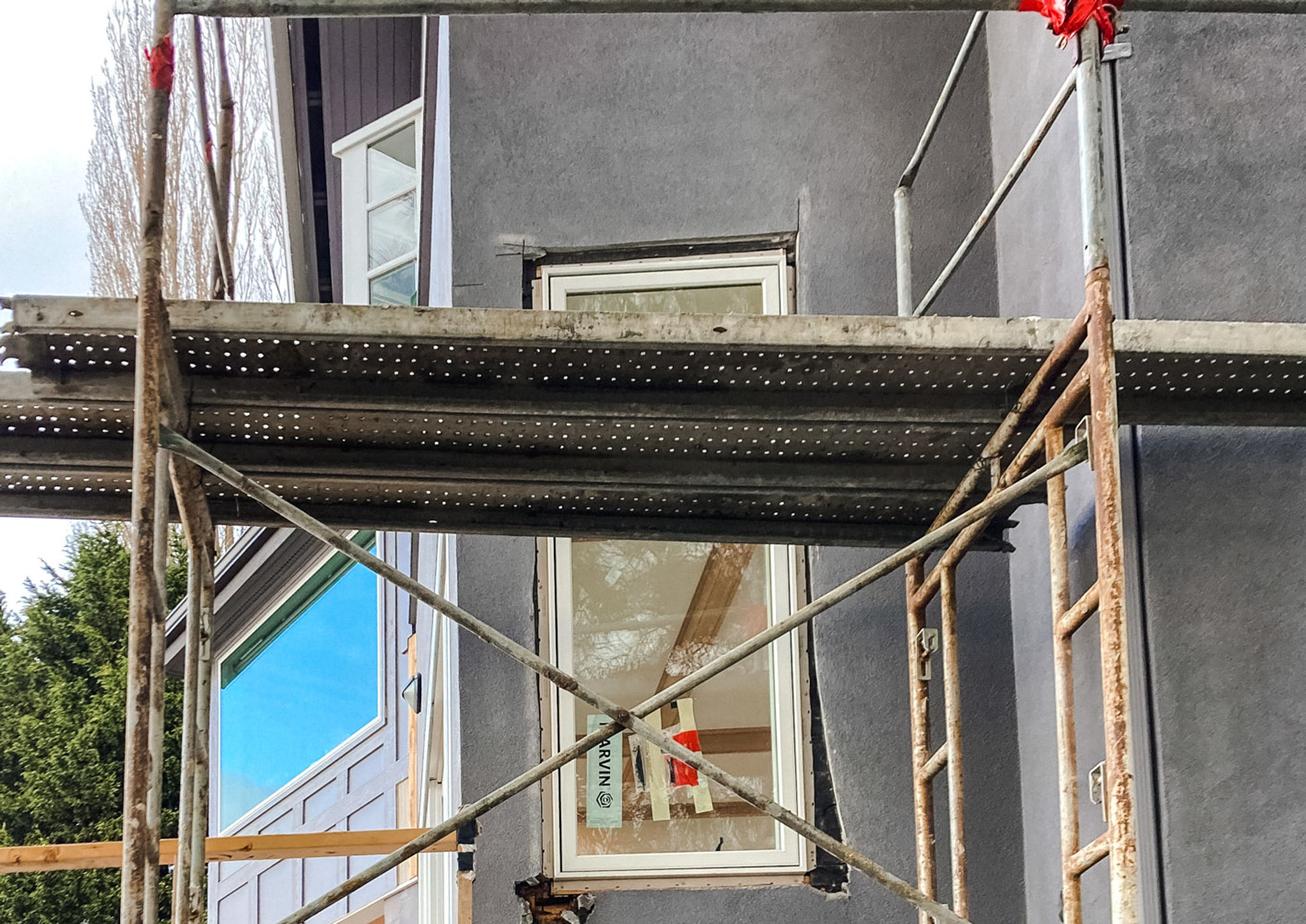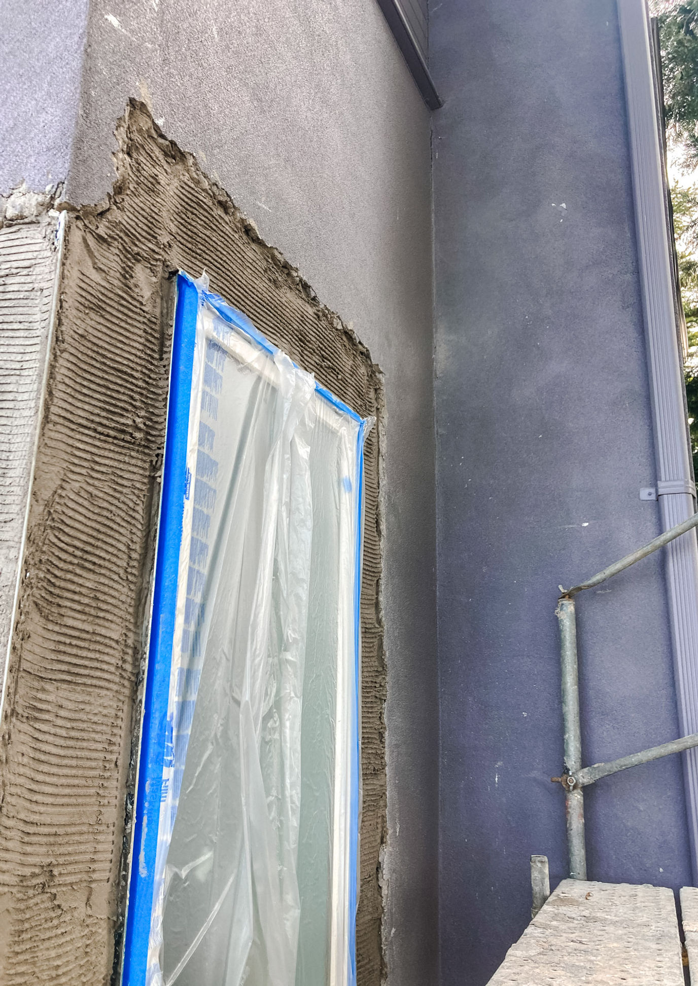This project breathed new life into an old home, with fresh stucco neatly masking all traces of repairs and making the architectural details really stand out. The building looks young and well-tended again.