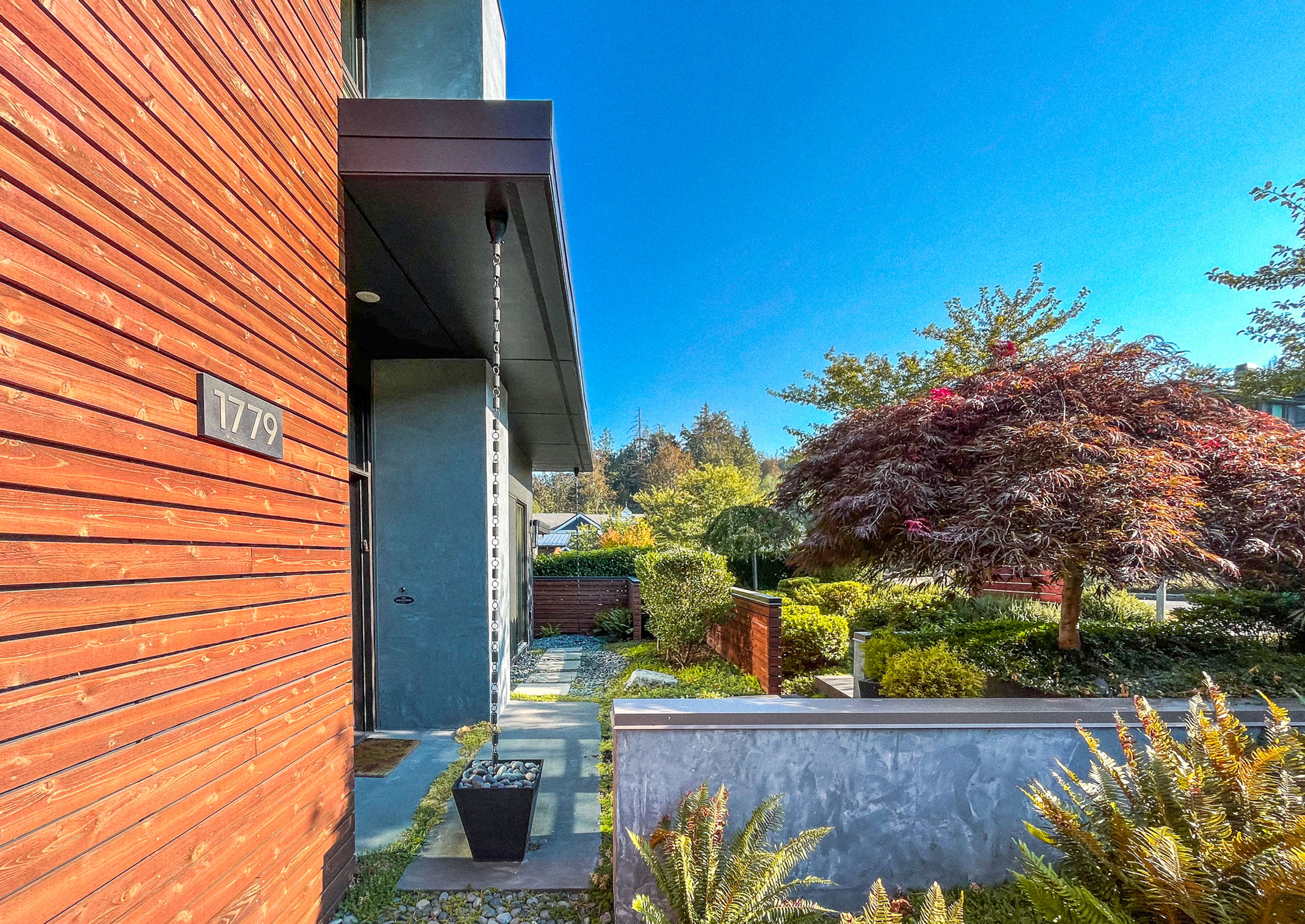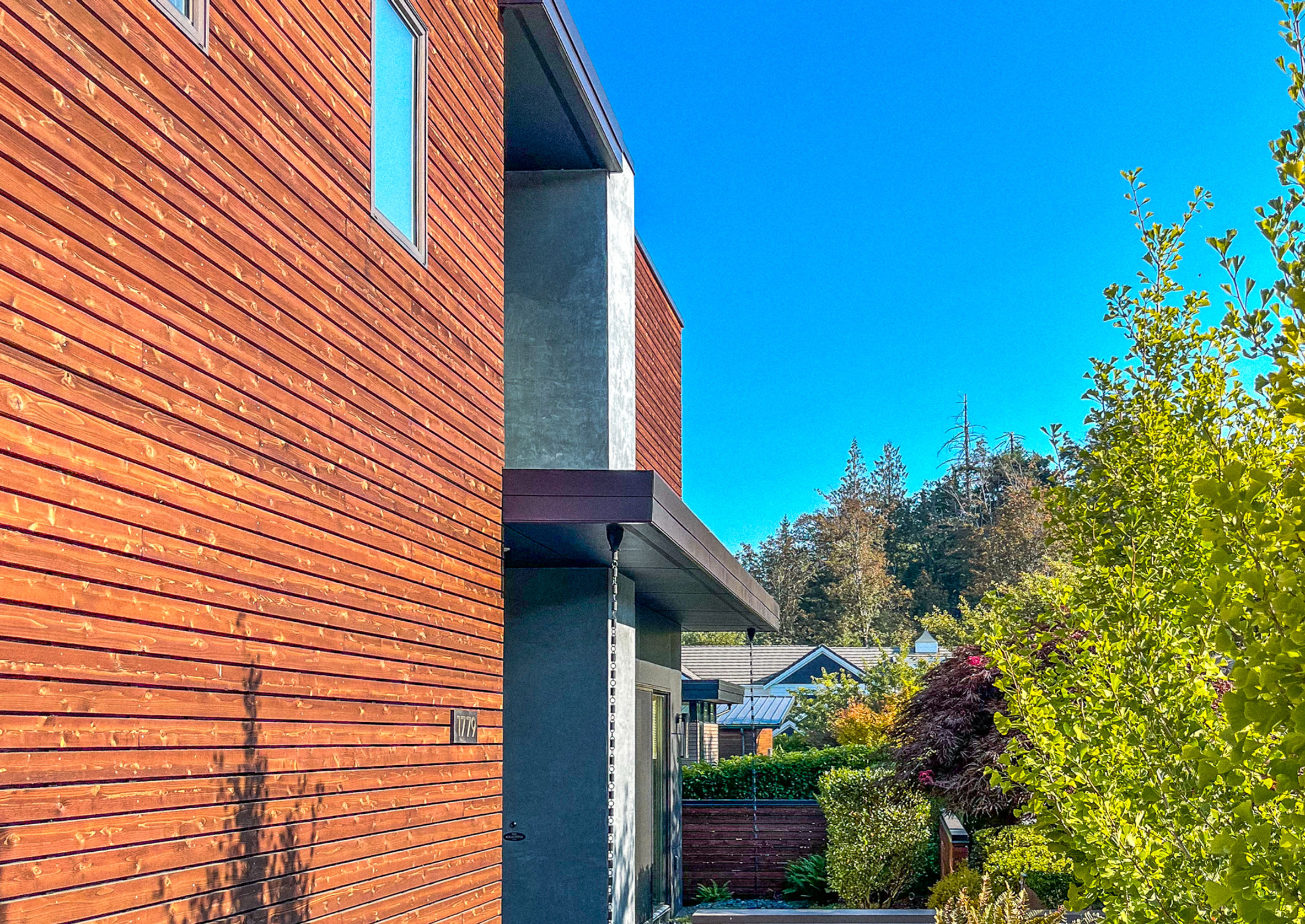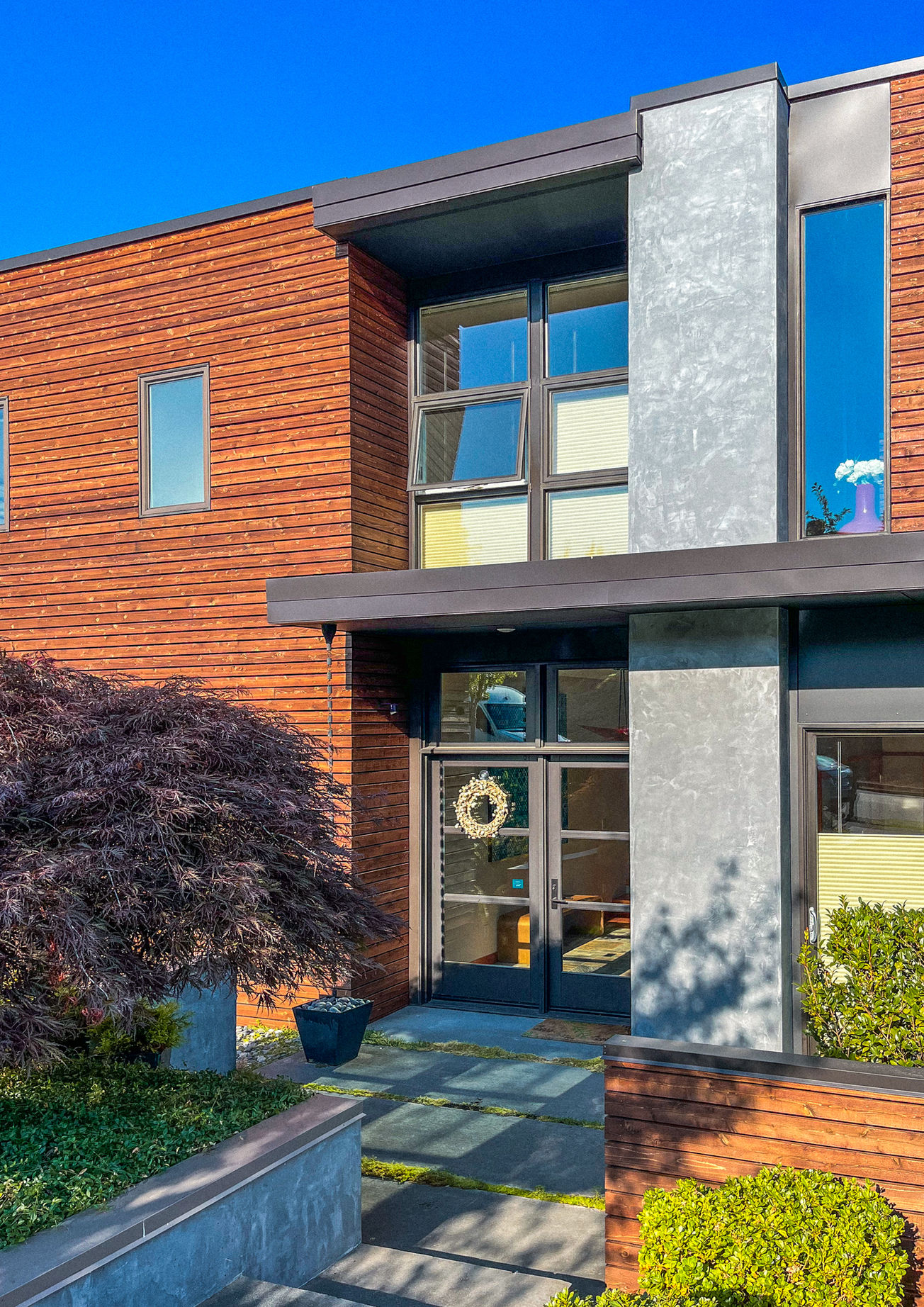 The facing of this cube-shaped home uses the Europlast material and K2 Stone. The clear lines, cedar siding and natural textures shout in unison, “There it is, modern style in all its glory!”
